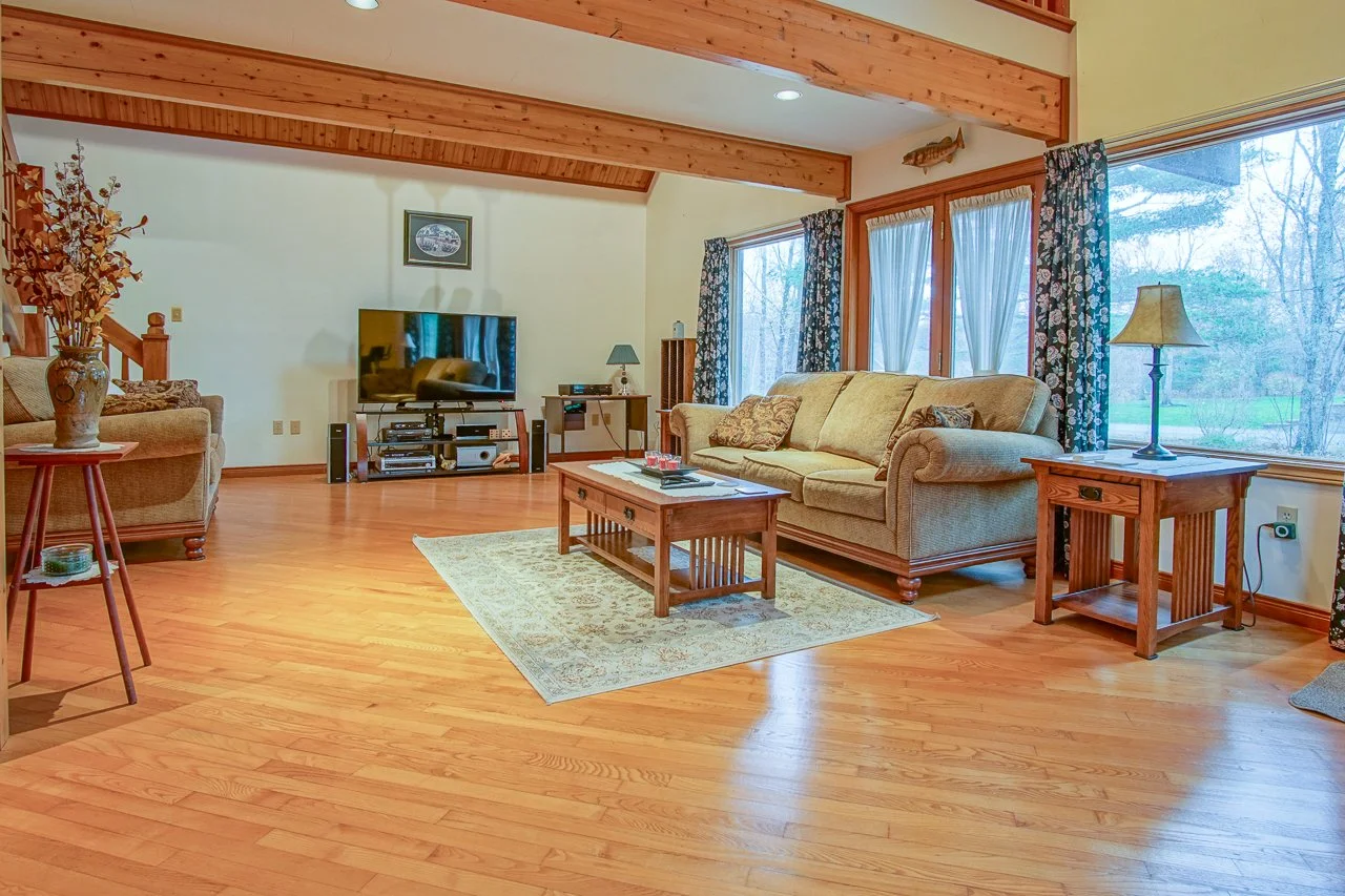 SOLD - Cambridge MLS-202527819 - Nestled on a private 1-acre lot this distinctive 3-bedroom, 2-bath Chalet-style home blends warmth, character, and natural beauty. The main level features a stunning 25-foot open living room with the flexibility to create a combined living and dining area or the current dining room could easily be used as a cozy family room, whatever best fits your lifestyle. You’ll also find a bright kitchen, a main-floor bedroom, and a convenient 2-piece bath. Upstairs, the primary bedroom includes direct access to a full 4-piece bath, along with a spacious third bedroom. This home showcases oak and ash hardwood floors, vaulted cedar ceilings, and abundant natural light throughout. Heating is provided by a ceiling radiant system, keeping comfort hidden but efficient. The exterior boasts vertical natural cedar siding, adding timeless appeal. Located in a quiet, friendly neighborhood near the Harvest Moon Trail, and just minutes from Berwick, Coldbrook, Kentville, and Michelin. A truly unique property offering privacy, charm, and convenience.